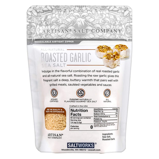 Garlic Flavored Sea Salt, Real all Natural Sea Salt Fused with Golden-brown roasted Garlic, Zip Top Pouch (3.5 oz)