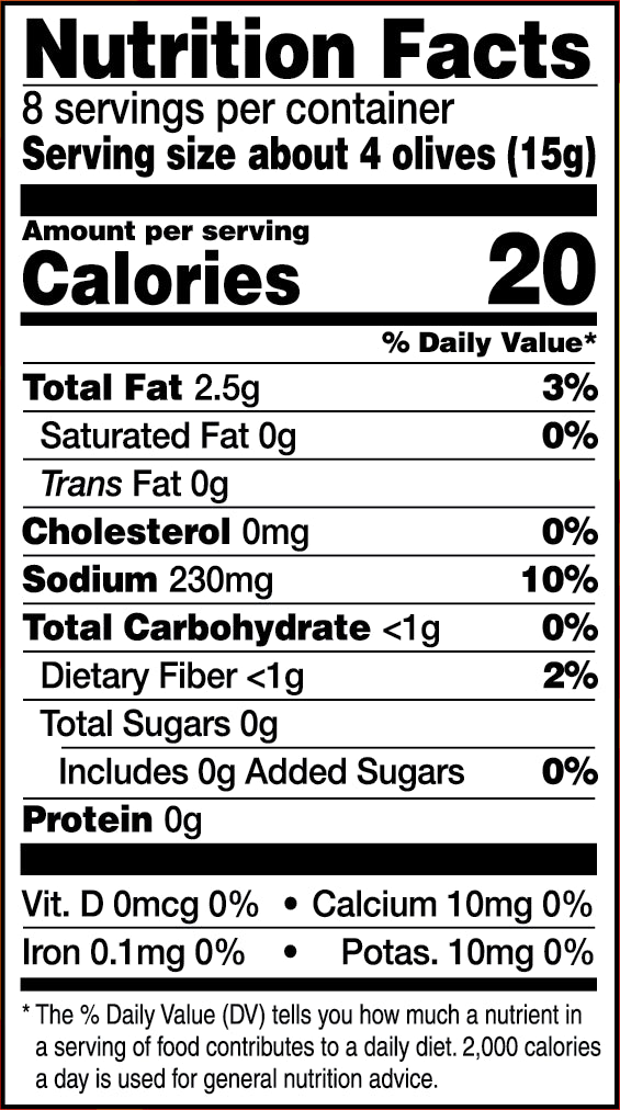- Ingredients: Green olives, chili peppers, garlic, spices, sea salt, citric acid (preservative)