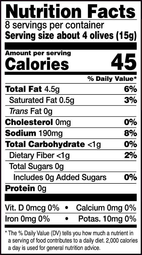 - Ingredients: Kalamata olives, extra virgin olive oil, sea salt, red wine vinegar, citric acid (preservative)